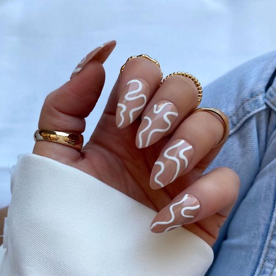 Embracing the timeless beauty of the ocean’s waves, this design features sinuous curves over a creamy nude base, reminiscent of the gentle ebb and flow of the tides. The use of white to create the wave patterns adds a touch of elegance to the overall design, making it a versatile choice for both casual and formal occasions. The acrylic almond shape maintains a sense of classic femininity, perfect for those who value a subtle nod to nature’s wonders.