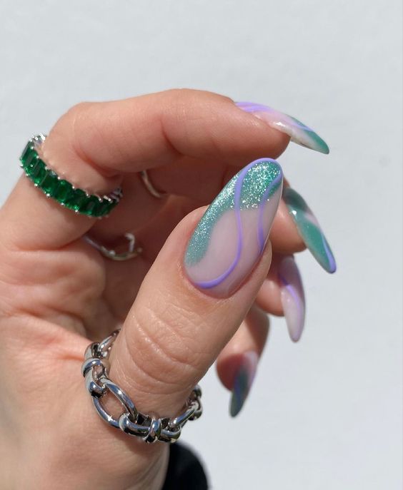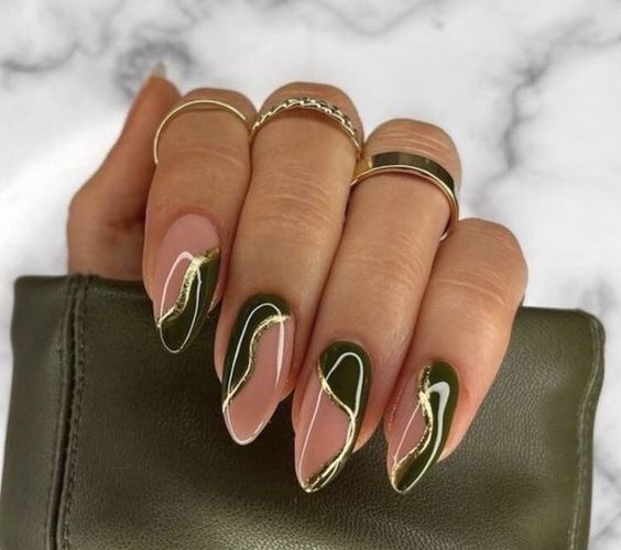 This nail design is a nod to the classic with a modern twist, featuring an earthy olive green paired with a neutral nude base. The standout feature is the gold foil that traces a sleek, sinuous line across each nail, adding a touch of luxury. This acrylic almond look is for those who love a bit of understated opulence in their designs. It complements gold jewelry beautifully and would be equally at home at a beachfront cafe or a sophisticated evening event.