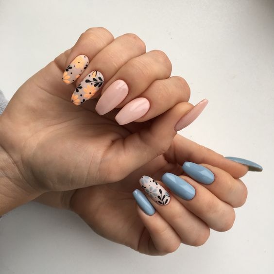 Here we have a delicate blend of pastel pink and blue with botanical accents creating a serene garden on your fingertips. The subtle polka dots and minimalist floral designs add a touch of whimsical charm. This style is perfect for those leisurely summer days, a simple yet refined choice for a brunch with friends or a relaxed afternoon in your favorite café.