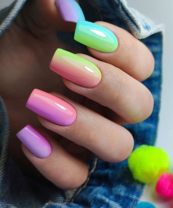 The electric energy of summer is encapsulated in this neon ombre design, featuring a smooth transition from pink to yellow to green. The vibrant colors are a nod to the carefree spirit of the season, and the glossy finish ensures your nails are nothing short of dazzling. This acrylic square design is a vibrant choice for the bold and the beautiful, ready to make a splash at any summer festivity.