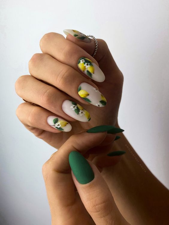 Freshly picked from a summer garden, these nails feature a zesty lemon and olive motif that’s ripe for the season. The acrylic designs on a white base are reminiscent of a Mediterranean escape, with splashes of yellow and green that bring to mind lemon groves and olive branches. This manicure, in a sophisticated almond shape, pairs beautifully with a flowy sundress or a crisp linen outfit, making it a fresh inspo for a day spent basking in the sun or a leisurely brunch with friends.
