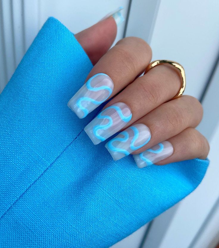 Cool off from the summer heat with nails that channel the tranquil waves of the ocean. This set features a translucent base with waves of sky blue and white, giving the impression of gentle sea foam lapping at the shore. The square shape provides a modern twist to the classic French tip, making it a stunning choice for those who prefer a clean, square acrylic look. It’s the embodiment of calm seas and clear skies, ideal for a peaceful retreat or a day spent lounging by the pool.