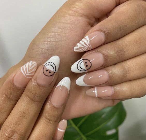 Last but not least, this acrylic set with a French tip twist brings in the clear skies of summer with a geometric pattern in blue and white. It’s as if the crisp lines of a summer resort’s architecture have been distilled onto the nails. The almond shape keeps the look feminine and versatile, making it an excellent choice for any summer adventure, be it urban exploration or seaside relaxation.