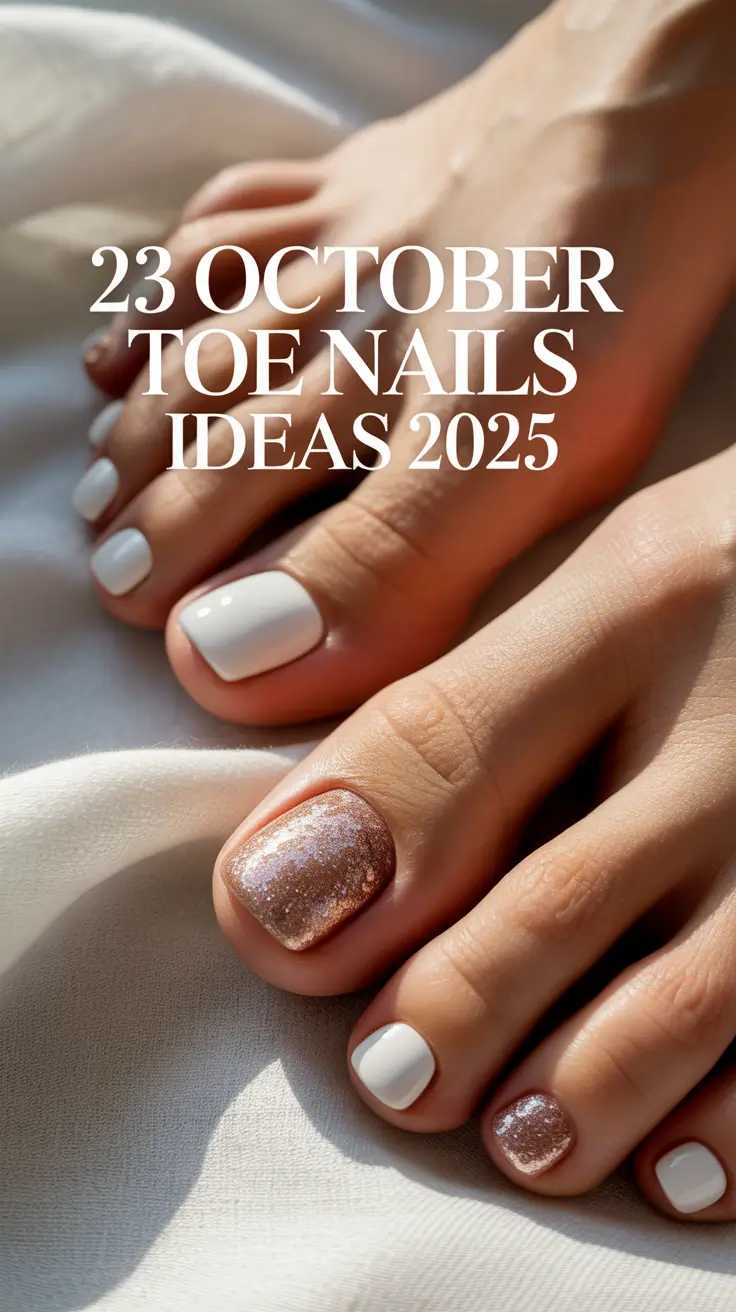 White toenails are simply elegant, but one rose gold glitter nail will instantly change the whole thing into glamorous. The starkness of clean white polish with a single glitter nail makes it feel current, fresh and ideal for October nights when you want a bit of extra sparkle. It’s minimal, but it never feels boring.