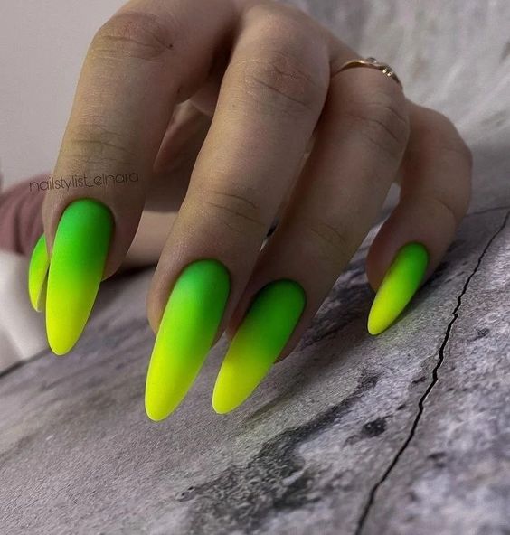 The electric allure of neon green merges into a soft lime, embodying the zest of summer in these trendy stiletto nails. This look is not just cute; it’s a bright statement piece. Embrace this fun transition from a zesty green to a mellow yellow, which pairs exquisitely with a simple white sundress or amps up a casual denim look.