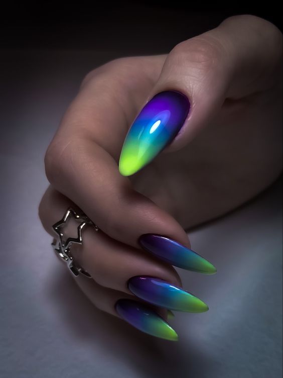 For the bold and adventurous, these stiletto nails are a cosmic journey with an ombre that flows from deep blue to vibrant green, pink, and yellow. This design is an expression of the 2024 long nail trend, offering a mesmerizing look that would pair brilliantly with a sleek black jumpsuit or a metallic party dress.