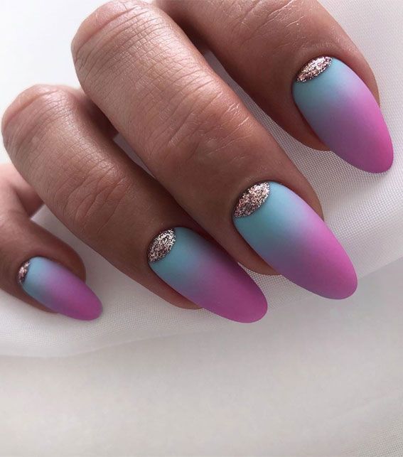 The soft blend of sky blue and sunset pink on these gel almond nails is reminiscent of a picturesque summer skyline. The addition of a glitter band adds a horizon-like effect, making these nails a trendy piece of wearable art. They’re ideal for adding a touch of glamour to a daytime event or a wedding by the beach.