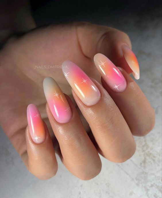 Capture the whispering tales of starlit skies with these oval nails, where a gradient of orange and pink simulates the fading light of dusk with delicate starburst designs. These nails could easily be a conversation starter at a summer soiree, embodying the trendy and fun aspects of 2024’s nail art trends.