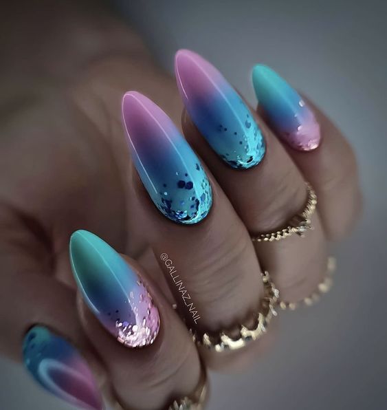 Dive into the depths of the ocean with these stiletto nails that boast a mesmerizing ombre blend of marine blue and lilac, sprinkled with glitter that mimics the shimmer of a mermaid’s tail. This enchanting design is a perfect match for a glamorous night out or a trendy beach party.
