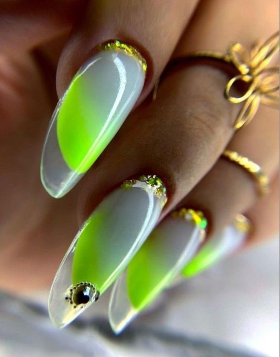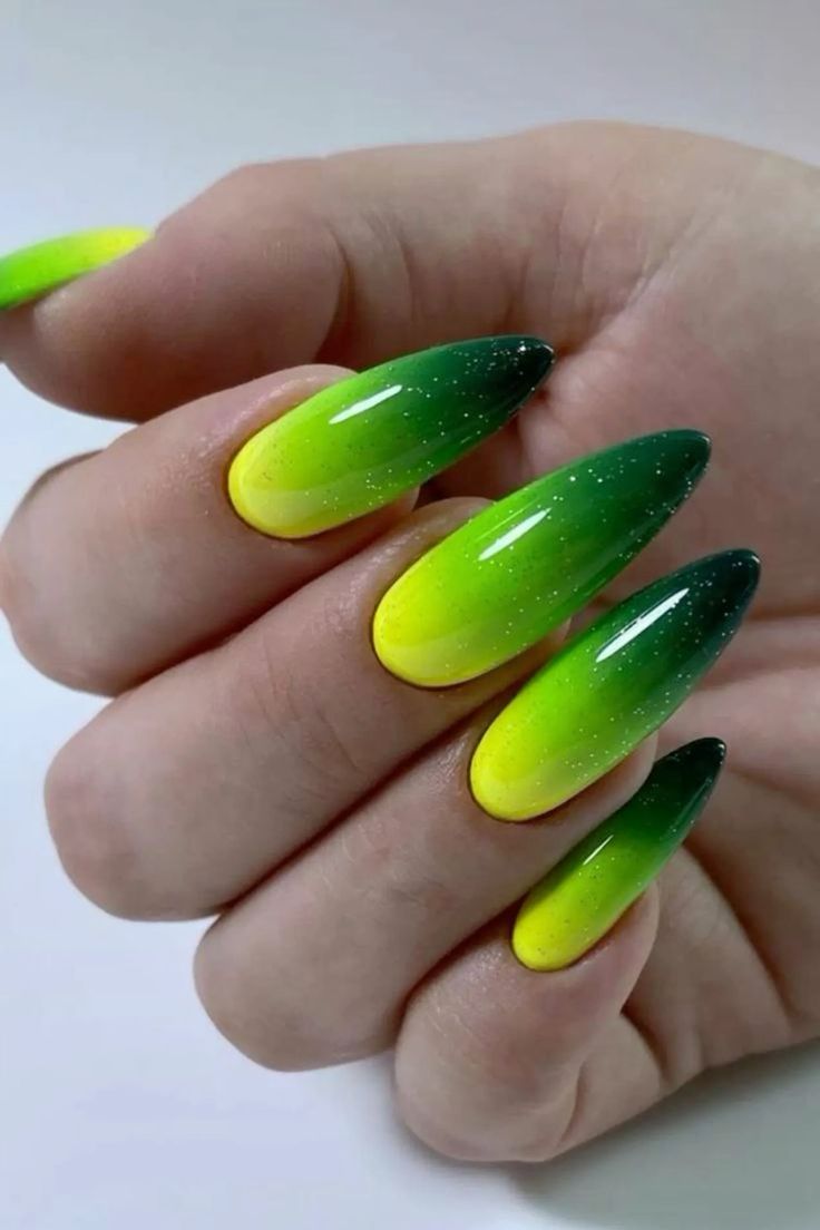 These long nails feature an ombre transition from electric lime to deep forest green, reminiscent of a neon sign against the night sky. The added sparkle effect brings a sense of fun and whimsy, ideal for those summer concerts or spontaneous road trips.
