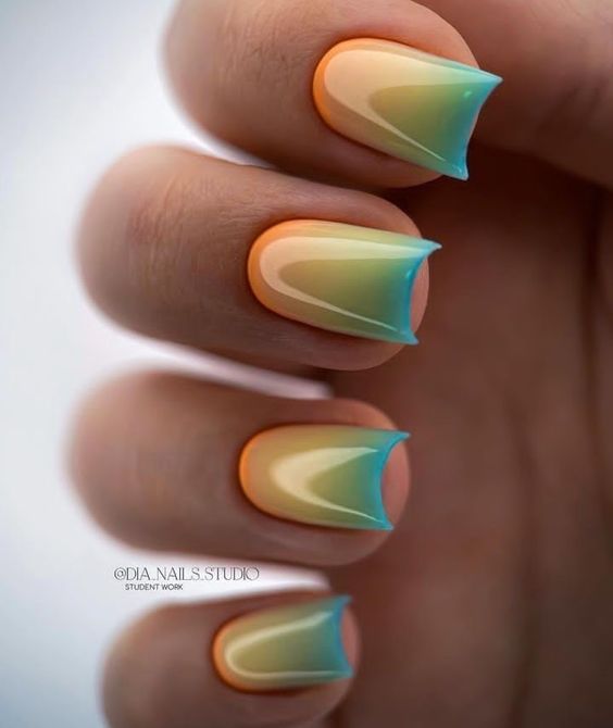 Capture the essence of a summer fruit sorbet with these short nails that combine bold pink, yellow, and orange in a stunning ombre effect. The gel finish adds a glossy sheen that’s as tempting as a refreshing treat on a hot day. These nails are a fun addition to a playful romper or a bright swimsuit, making them a trendy choice for a poolside party or a day at the fair.