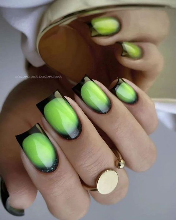 Dare to be different with these bright neon green nails, edged with a glitter tip. This design is perfect for the woman who loves to stand out. The ombre fades into a deep black, making it a trendy choice for both day and night ensembles. Ideal for those who prefer a short acrylic style, it’s a bold yet fun summer statement.