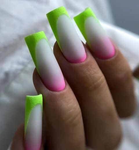 Take a walk on the wild side with these long stiletto nails featuring a bright neon green edge. The white base flows into a hot pink tip, making these nails a fun and trendy choice for the summer. Ideal for those bold enough to wear them, these nails will perfectly complement a monochrome outfit or a playful summer dress.