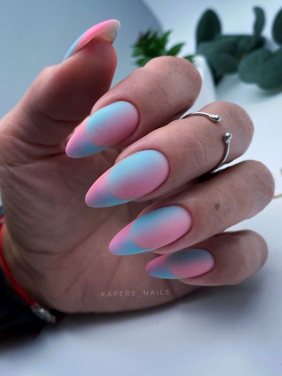 These almond nails are like a canvas painted with the soft colors of the sky at dusk. Blending blue, pink, and white, they create an ethereal ombre effect that is both cute and trendy. The 2024 gel almond trend is well represented here, providing a simple yet classy option that would look heavenly with a flowing maxi dress or a casual tee and shorts combo.