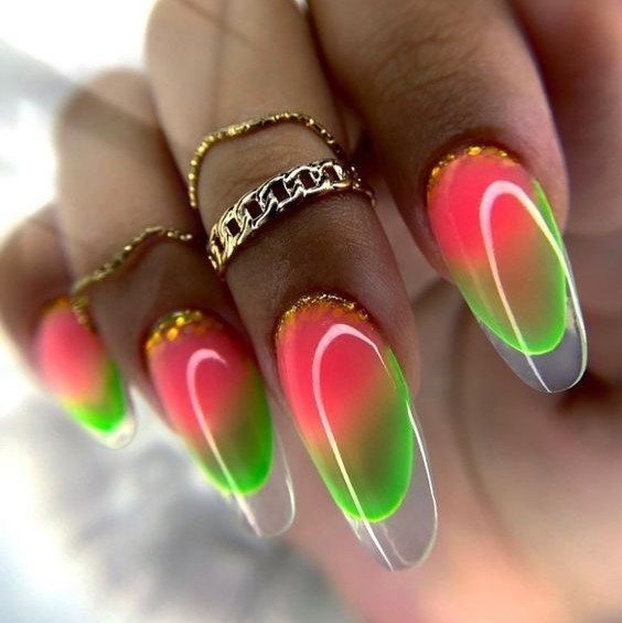For those who dare to dream in neon, these almond nails with glowing green edges are the epitome of summer nightlife. The glitter lining adds a touch of glamour, making them a standout accessory for any evening event.
