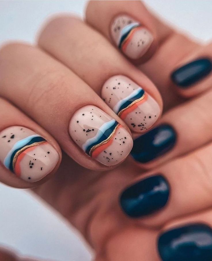Immerse yourself in the tranquility of the ocean with these enchanting round nails, evoking a sense of calmness with their deep blue hues and sandy tan speckles. A thin, undulating line of orange and blue separates the serene blue from the playful freckles, reminiscent of a horizon where sea meets shore. The design speaks to those who carry a piece of the ocean’s soul within them, perfect for a breezy summer evening by the beach or a casual stroll down the boardwalk.