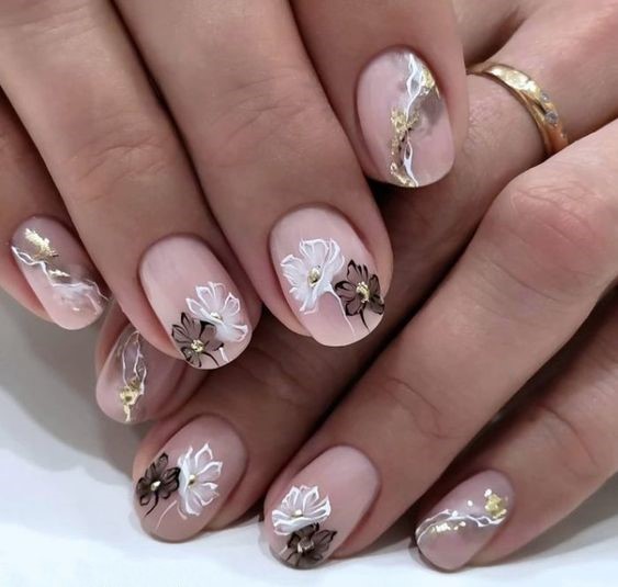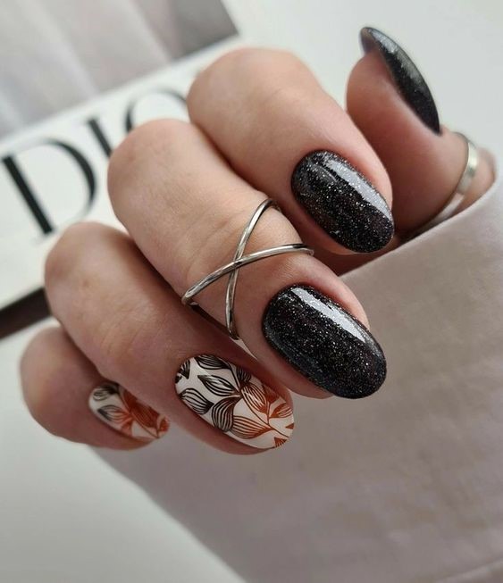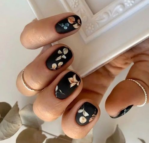 The dramatic elegance of night-blooming flowers is encapsulated in this sophisticated nail design. Black serves as the canvas for delicate floral motifs in shades of white and tan, each petal and leaf placed with intention. The round nails serve as small, cute windows into a mysterious garden, ideal for the romantic at heart. Pair these with an elegant black cocktail dress or a sharp blazer for a touch of nocturnal glitter in your daytime attire.