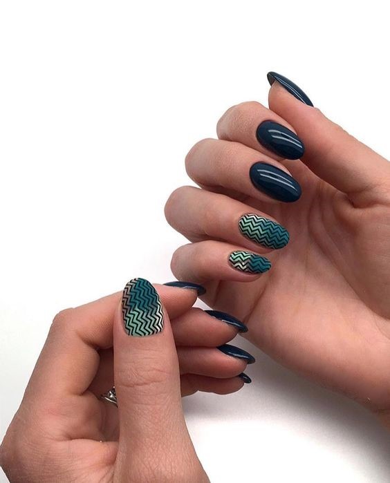 Embrace the depth of the ocean at night with these luscious, long round nails. The dark blue base is a nod to the 2024 nocturnal trend, while the bright teal zigzag patterns inject a pulsating energy, reminiscent of waves under the moonlight. These are for the bold, the daring, who aren’t afraid to make a statement, whether at a glamorous evening event or a black tie affair.