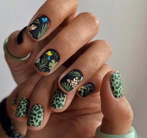 Venture into the exotic with these medium length round nails that capture the essence of a tropical paradise. The green backdrop serves as the canvas for a vivid narrative of wildlife and foliage. Each nail tells a part of the jungle story, alive with colors of flora and fauna. Pair them with an earth-toned ensemble to let your hands do the talking on your next summer adventure.