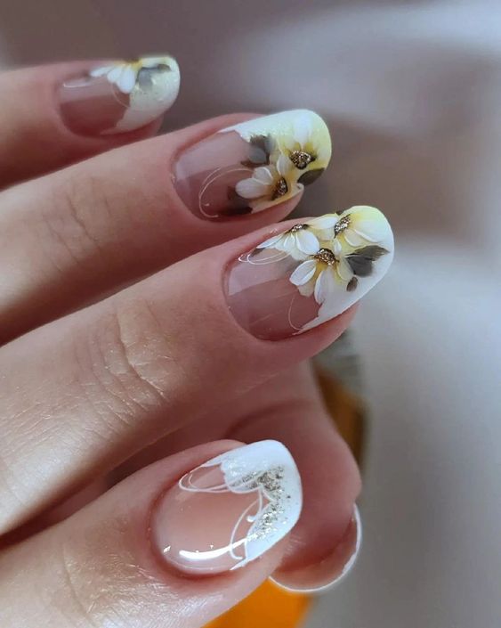French tip short nails find new life with an artistic twist in this design. The translucent tips bloom with tender flowers, accented with a sprinkle of glitter and a soft white curve that embodies the French tip legacy. These nails are a whisper of romance, perfect for a summer wedding or a sunlit garden party, complementing a lace dress or a pastel-colored summer hat.