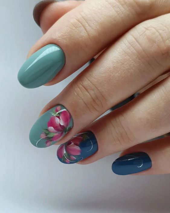 A romantic night garden comes to bloom on these round nails. The combination of muted green and deep blue sets a serene stage for the pink flowers that seem to dance across the fingertips. This design balances bright and shadow, making it a sophisticated choice for both daytime and after-dark engagements, befitting a silk blouse or a velvet evening gown.