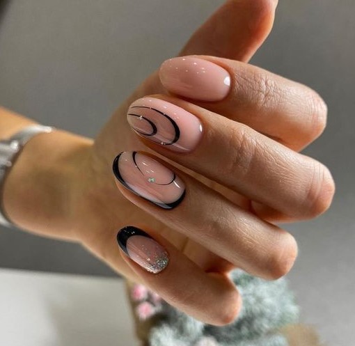 The softness of pink is reimagined with bold black swirls and a dash of glitter on these short round nails, capturing the playful yet refined spirit of summer 2024. This design is a modern take on the classic French tip, offering a new twist on the oval vs square debate with its round shape and artistic flair. Pair this with a structured blazer or a whimsical summer dress for a versatile look.