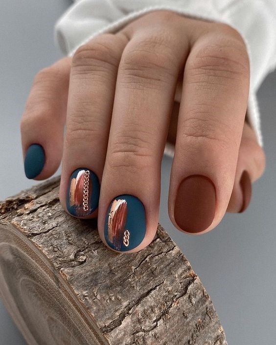 Drawing inspiration from the earthy tones of the desert, these medium round nails feature a serene blue with strokes of metallic copper, giving a nod to the natural beauty of sandy landscapes. The small hints of white and glitter mimic the sparkle of a sunlit shore. Ideal for a casual day out or a sunset gathering, these nails will pair beautifully with earth-toned apparel and natural accessories.