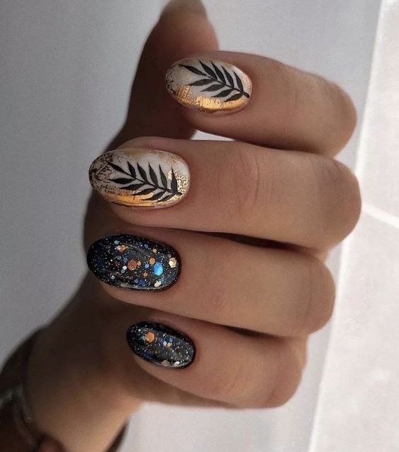 Welcome the mystery of twilight with these long round nails. A base of black and blue serves as the night sky for the golden foliage and floral designs, creating an elegant contrast that speaks of midnight gardens and whispered tales. The glitter accents are like stars peeking through a dark canopy, making this design perfect for an evening of fine dining or a sophisticated soirée.