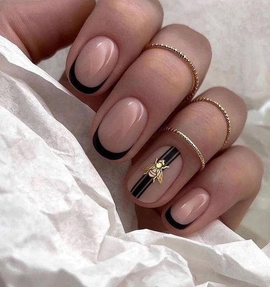In the world of French tip short nails, less is often more. This design reaffirms the beauty found in simplicity with its natural pink base and a bold, black outline that adds a modern twist to the classic French tip. A solitary golden bee sits upon one finger, symbolizing industriousness and the sweet nectar of life. This simple, yet sophisticated look, is ideal for the professional woman who appreciates a subtle nod to nature amidst her busy life.