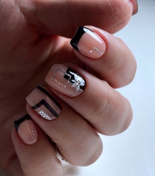 These short round nails present a dreamy landscape in monochrome. The blend of black, white, and glitter creates an abstract art piece, with each nail contributing to a cohesive story of modern elegance. The design’s versatility makes it suitable for both a simple day look and an edgy evening ensemble, fitting the fashion-forward woman who moves seamlessly between various roles and occasions.