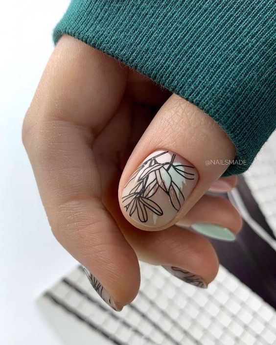 Nature’s delicate whispers come to life on these short round nails, where every stroke of the leafy designs tells a story of growth and serenity. The soft neutral base brings forth the intricacy of the black etched leaves, offering a simple yet cute aesthetic that mirrors the natural world. This look would be a lovely complement to a light, tan summer dress, carrying with it the spirit of a peaceful walk through the park.