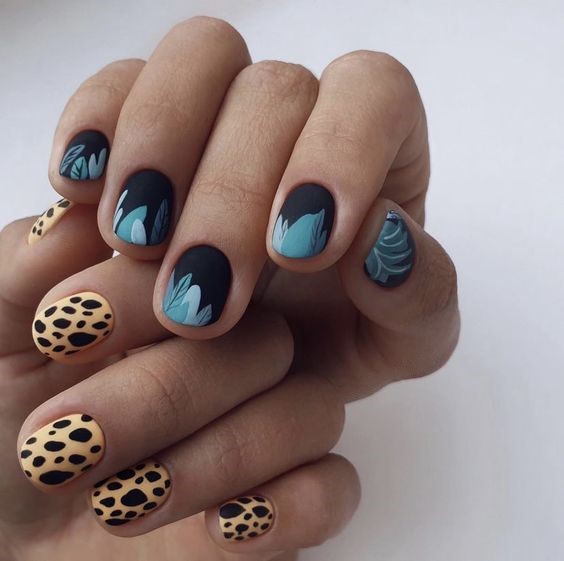 Dive into the wild side of summer with these bold round nails that blend the allure of a midnight safari with the playfulness of a daytime adventure. The contrast between the black background and the bright pops of teal portrays a day-to-night versatility, while the leopard spots in tan hues add a dash of untamed fun. These nails would be stunning with a crisp white blouse and tailored shorts, ready for both the urban jungle and the seaside escape.