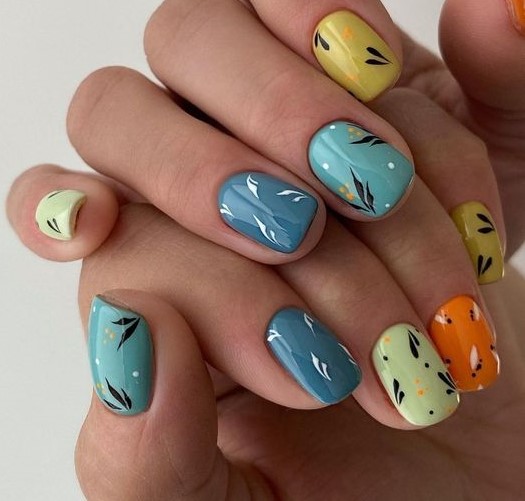 As if painted by the summer wind, these bright, medium round nails feature a refreshing palette of sky blue, soft yellow, and speckles of black. They capture the lightness of a fun summer day, the colors reminiscent of a seaside escapade or a picnic under the sun. This lively design pairs wonderfully with flowy sundresses or a white linen top, embodying the free-spirited joy of the season.