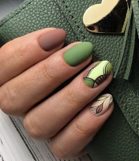 Echoing the contemporary merge of urban life with green spaces, these acrylic round nails celebrate the beauty of modernity and nature. The matte green and tan complement the white line art of foliage, creating a trendy yet simple tableau perfect for the eco-conscious fashionista. They’re a match for the smart-casual work ensemble or an organic cotton tee for weekend brunches.