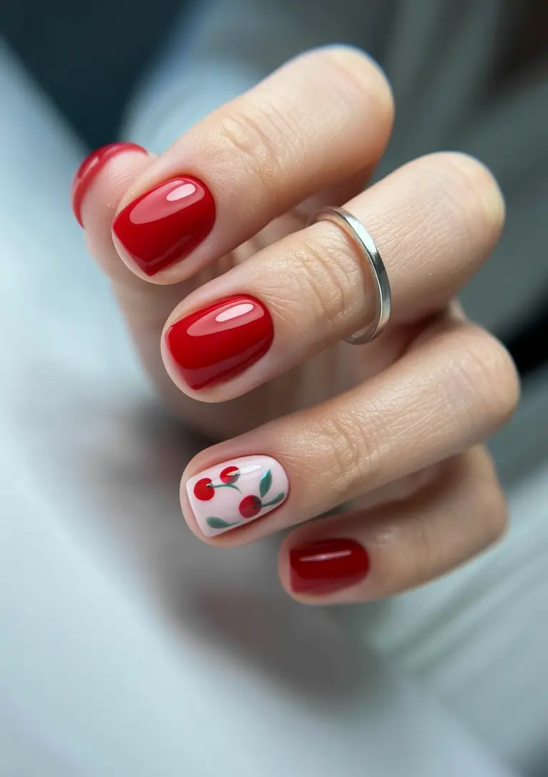 To recreate this look, I always recommend a high-gloss gel base like OPI’s Big Apple Red for that luscious cherry tone. The accent nail should have a subtle layer of Essie Ballet Slippers, dot the cherries with a dotting tool, and finish the leaves with a precision brush. For the best durability of your fruit design at pool parties, a gel top coat is essential.