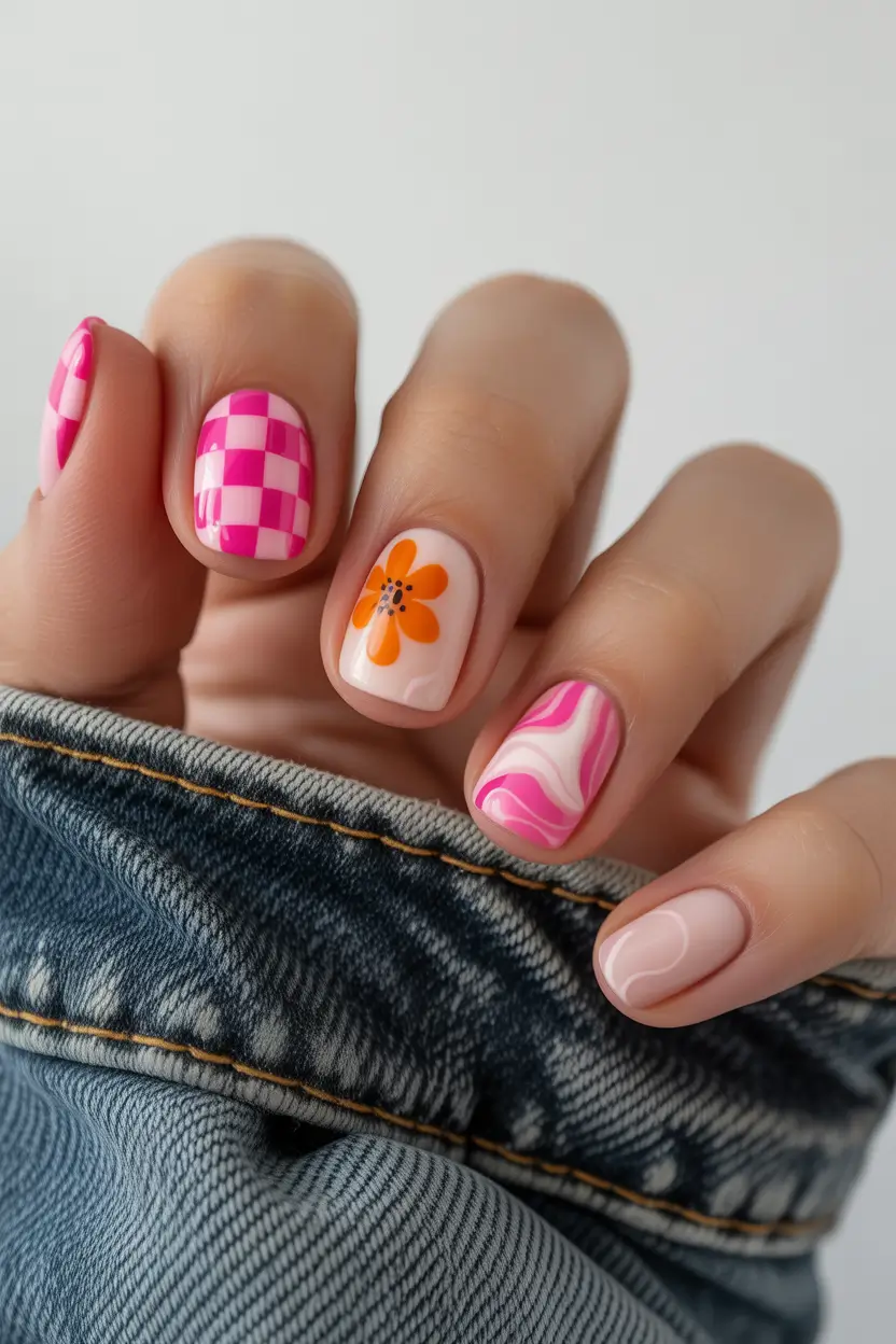 Don’t be deceived by its look – this trend lets you play around with various elements, without much effort. Further, neutralizing the base makes it even more appealing on short nails in the summer months. Think of it as a nail-theme assortment you’re building. Just the right Y2K vibe, flower-inspired charm, and a sweet splash of pink.