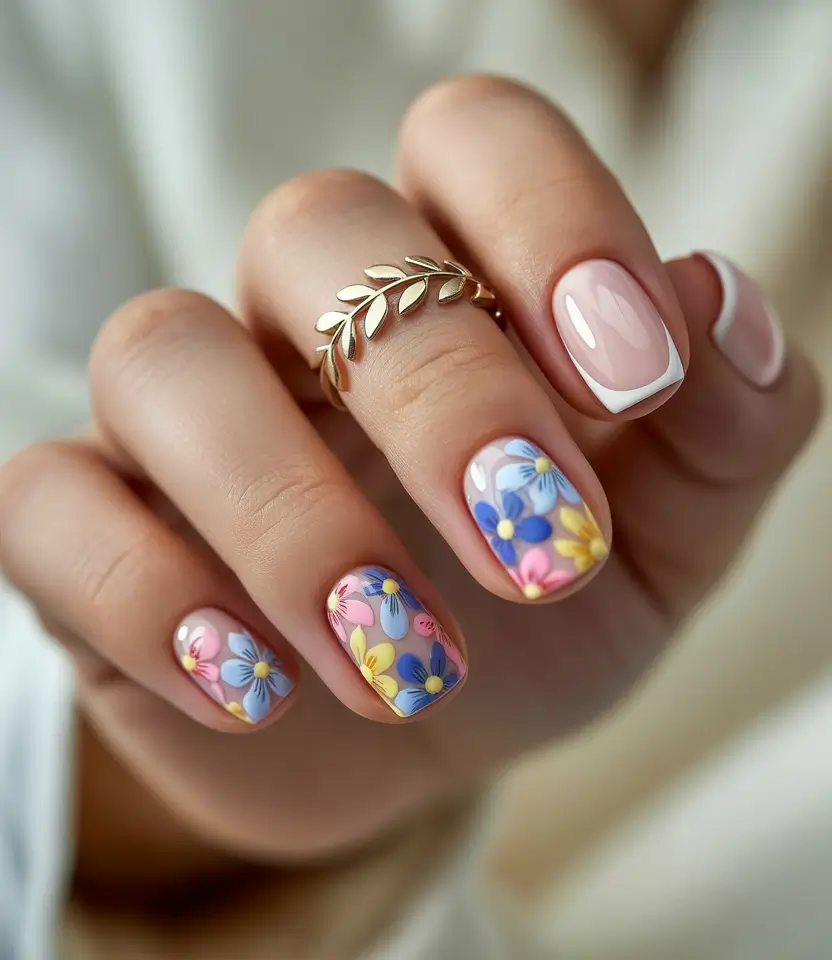 This design appears like a bright festival with massive graphic flowers, poppy colors, and that eye-grabbing pink. The rash of sheer nude highlights and bright yellow make this design feel lively, fun. The hand-painted florals with blue centres have a creative touch and are still comfortable to wear, and give life to the traditional 2025 almond shape.