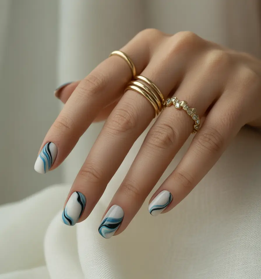 This 2025 blue swirl design is refreshing, clean and just elegant, bringing a soft ocean breeze to short summer nails trends 2025. With a soft, matte white base, the nails set an easy canvas to display lacy lines of navy, turquoise, and slate that ripple across the surface. What makes it so dreamy is its soft energy: It continues to be easy and understated, and its appeal lies in small, subtle details. Minimal but never boring.