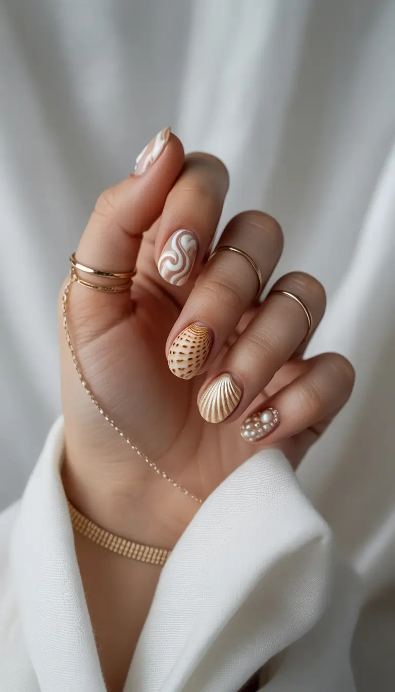 These soft waves and subtle pearl highlights and shell-like textures, combine to make this summery beach vibe in a bottle. Each nail tells a mini story: There’s a nail designed in the shape of a clam’s curve, others are decorated with pearls and soft sandy neons that give the impression of that sunlit summer glow. It’s a distinctively creative and a perfect match with the current “mermaidcore” trend, which is still fashionable in 2025.