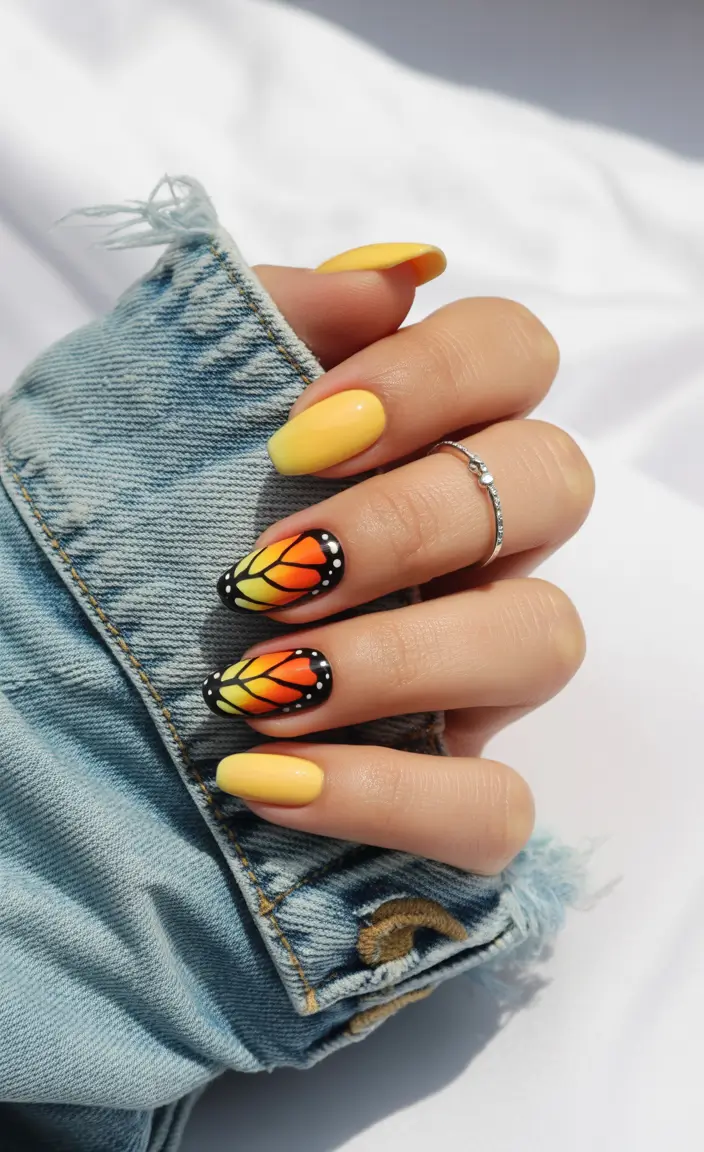 Butterfly nails are back and this version – bright orange wings with 2025 yellow accents – is really festival-worthy. The wings pop out magnificently on the matte black background like stained glass with the delicate dot work to give the focus. These designs exude that 2025 energy, and the air is filled with sunshine regardless of whether it is sunny or not.