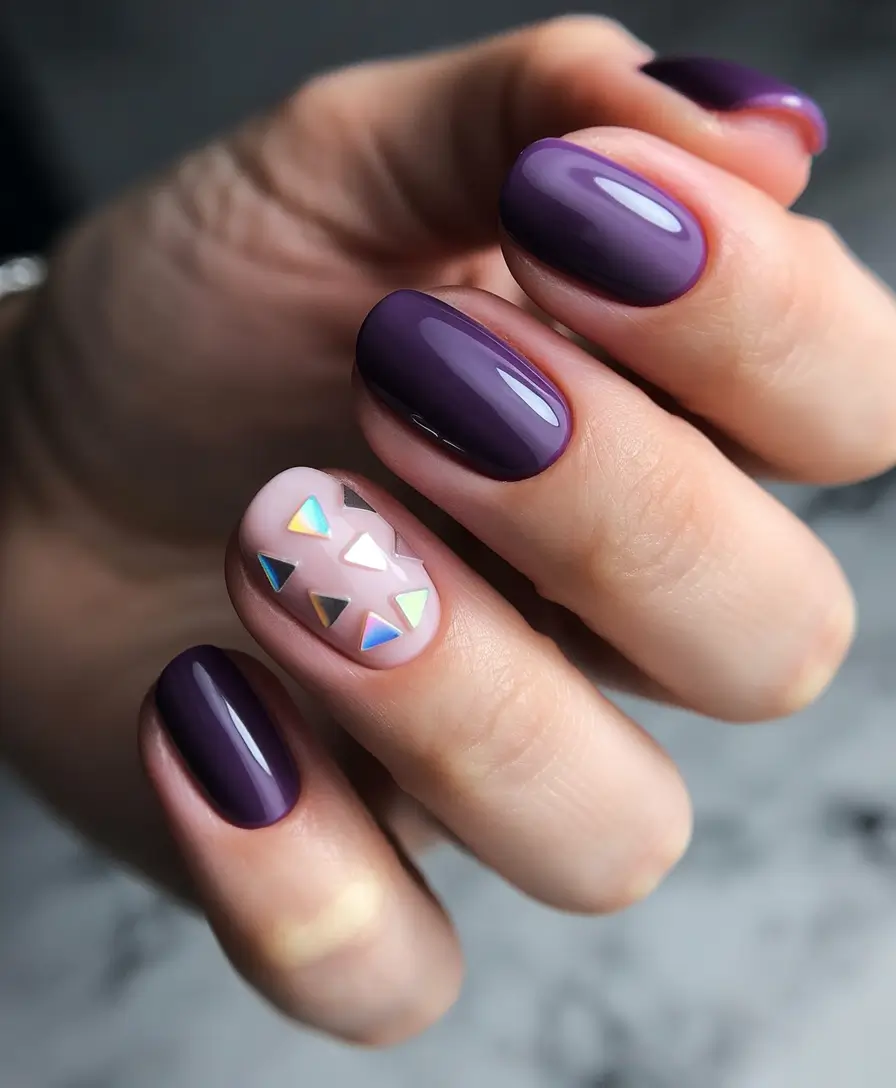 A retro but sophisticated purple nail and a holographic feature nail come together to give a look that is sophisticated and a little glitzy. It’s a quiet, maximalist version of plain polish — one shiny nail shining against a sea of dark, rich plum. This is the design for those who want a more refined amount of glamour.