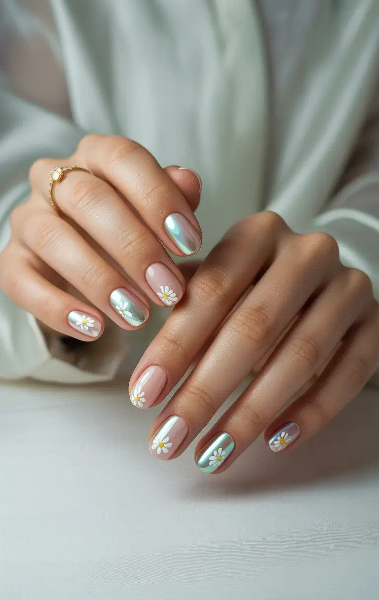 The combination of soft elegance and extraterrestrial charm is what you get with this special nail appearance. A combination of mint and baby pink chrome completes the hand-painted daisies, for an overall manicure that’s part spring fairy tale, part outer space. It’s equal parts 2025 natural and fantasy, and it glows — literally — when the light hits it just right.