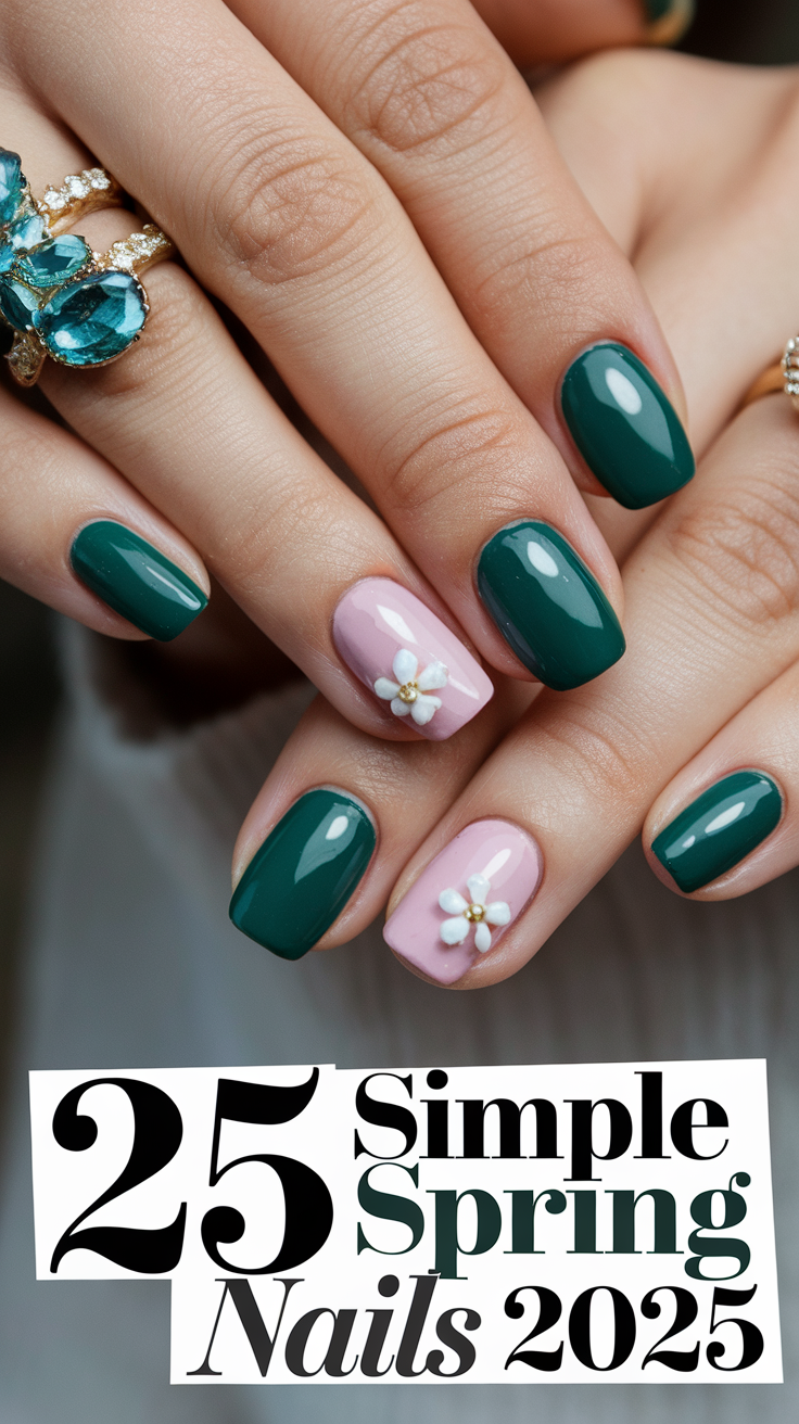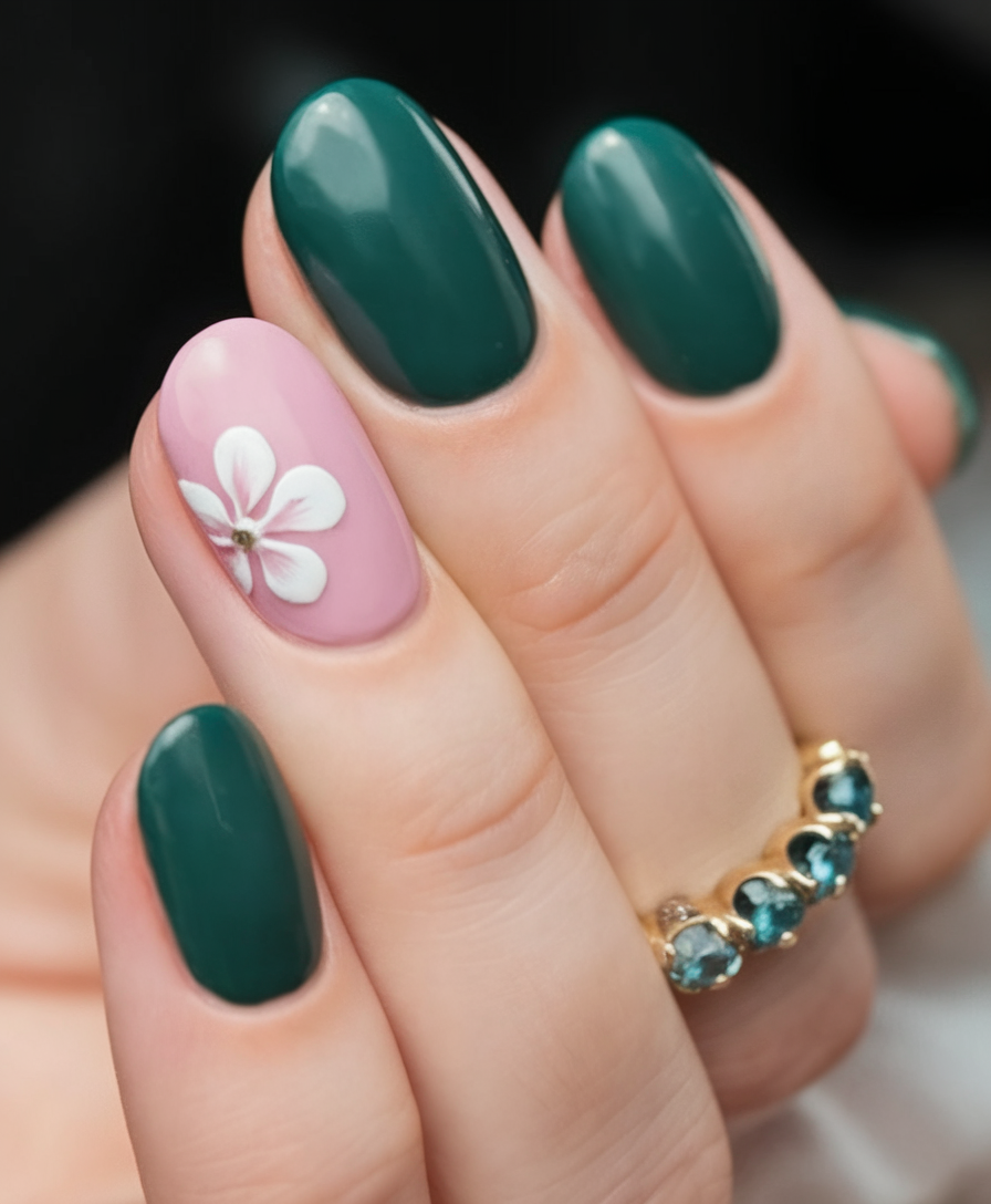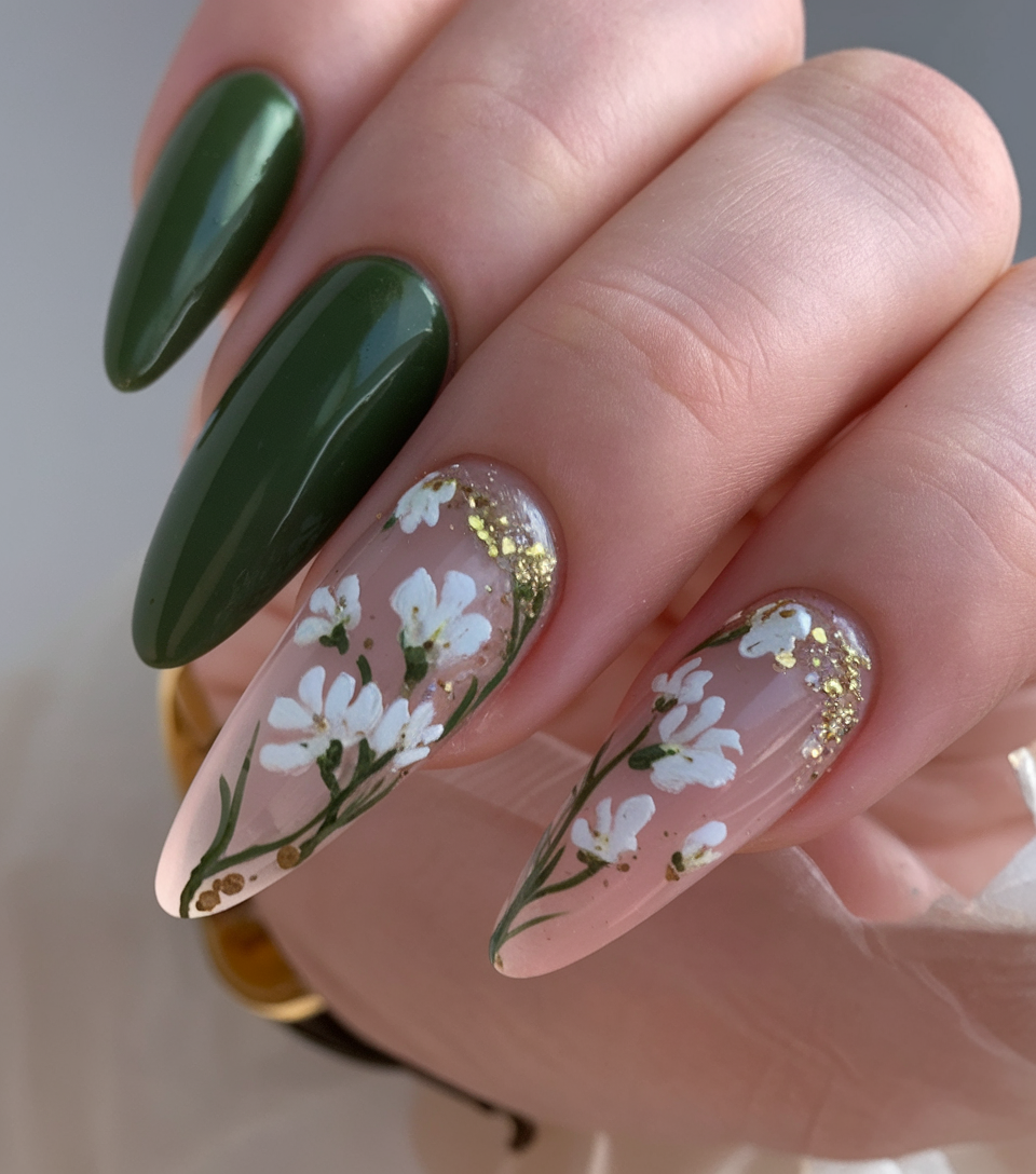 This ideas green manicure combines a deep, rich shade with a soft pink accent nail featuring a hand-painted flowers detail. The contrast between dark and light tones adds an elegant and refined touch to the design. The medium almond shape enhances the femininity of this chic spring look. If you’re searching for ideas 2025 that mix bold colors with delicate accents, this is a must-try.