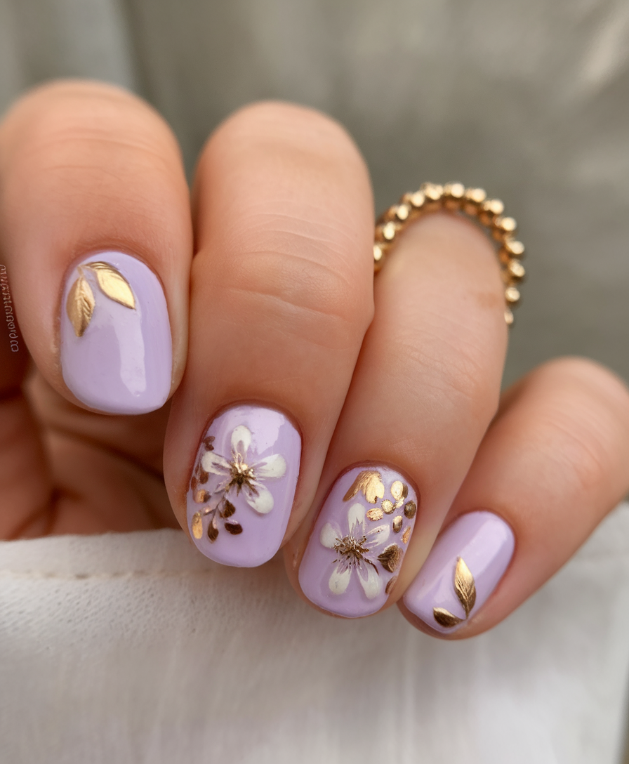 This design features a soft pastel lilac base, making it perfect for Easter and spring. The nails are decorated with delicate flowers, detailed with gold accents for an elegant, artistic look. The medium length and squoval shape add a natural touch, balancing beauty and practicality. This is a great choice for anyone looking for very stylish yet subtle ideas 2025.