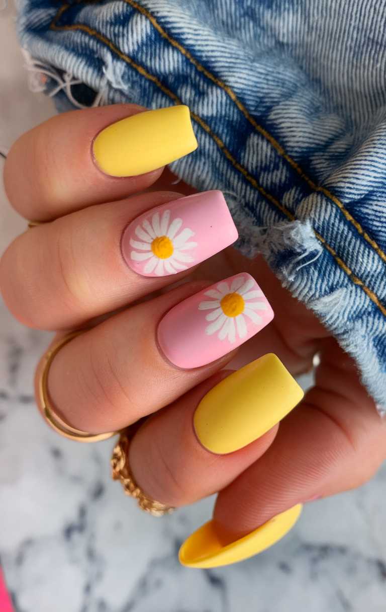 #16 Cheerful Yellow and Pink Daisy Nails