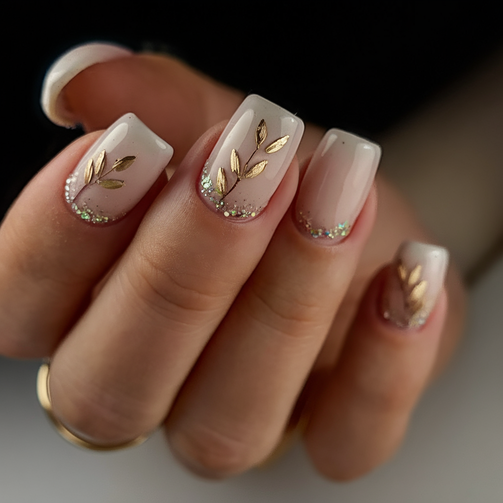A sophisticated take on plain manicures, this design features a soft beige base with gold leaf accents and a touch of chrome glitter. The glossy finish and square shape give it a modern yet classic appeal. This look is perfect for those seeking ideas 2025 that are very stylish yet understated. Whether for a special occasion or an everyday glam look, this ideas green and gold combination is effortlessly chic.