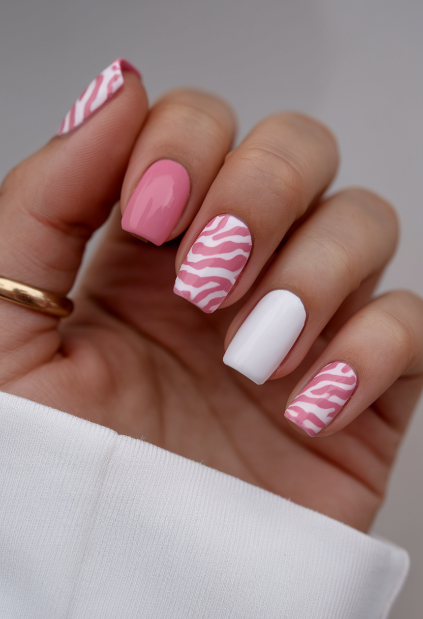 This super trendy manicure combines soft pink and classic ideas white with a bold zebra pattern for a fun twist. The mix of glossy and plain finishes adds depth to the design, making it stand out while staying elegant. The squoval shape and medium length keep it modern and stylish. If you’re looking for ideas pink with an edgy yet wearable pattern, this is the perfect spring inspo.
