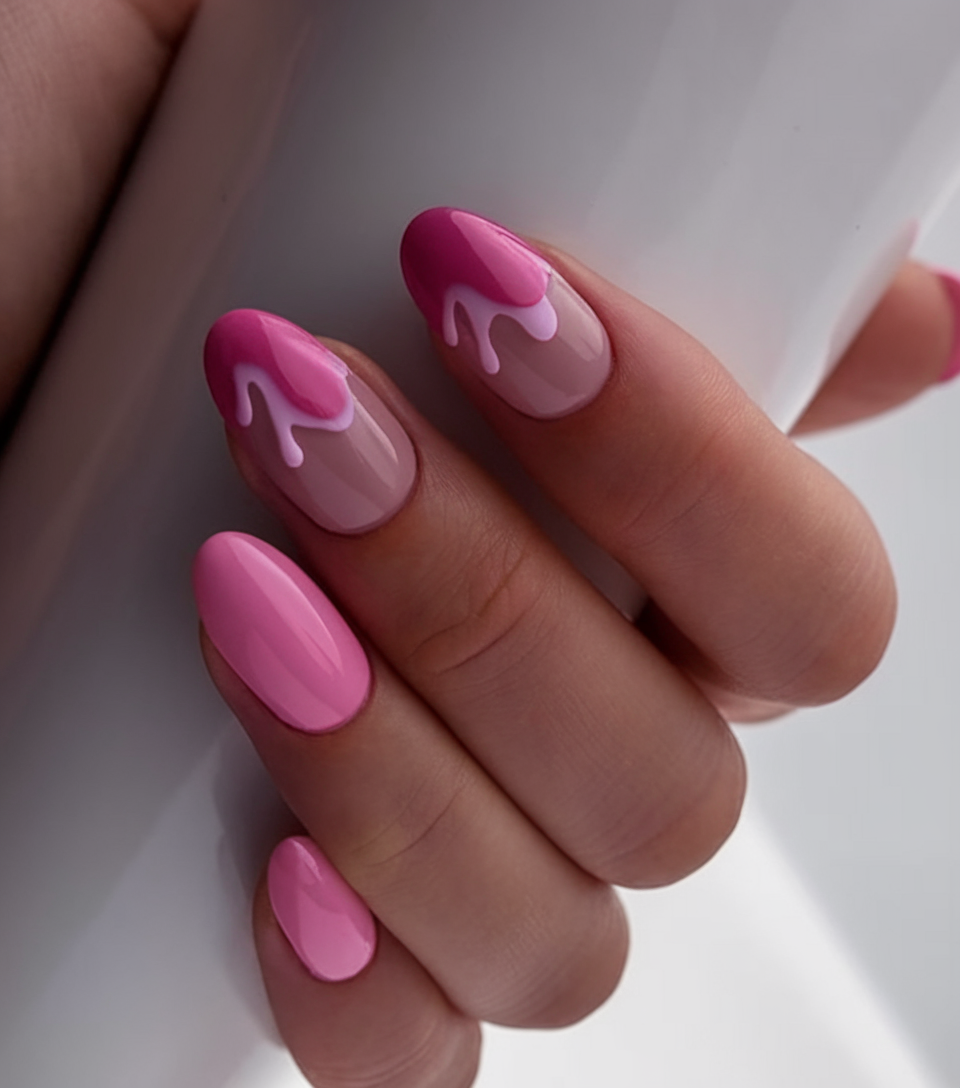This design is a creative take on simple spring nails 2025, featuring glossy pink tones with a unique drip effect. The soft nude base allows the bold pink to stand out, creating a stylish contrast. The ideas oval shape enhances the elegance of this fun and modern manicure. If you’re looking for ideas pink with a trendy twist, this is a super choice.