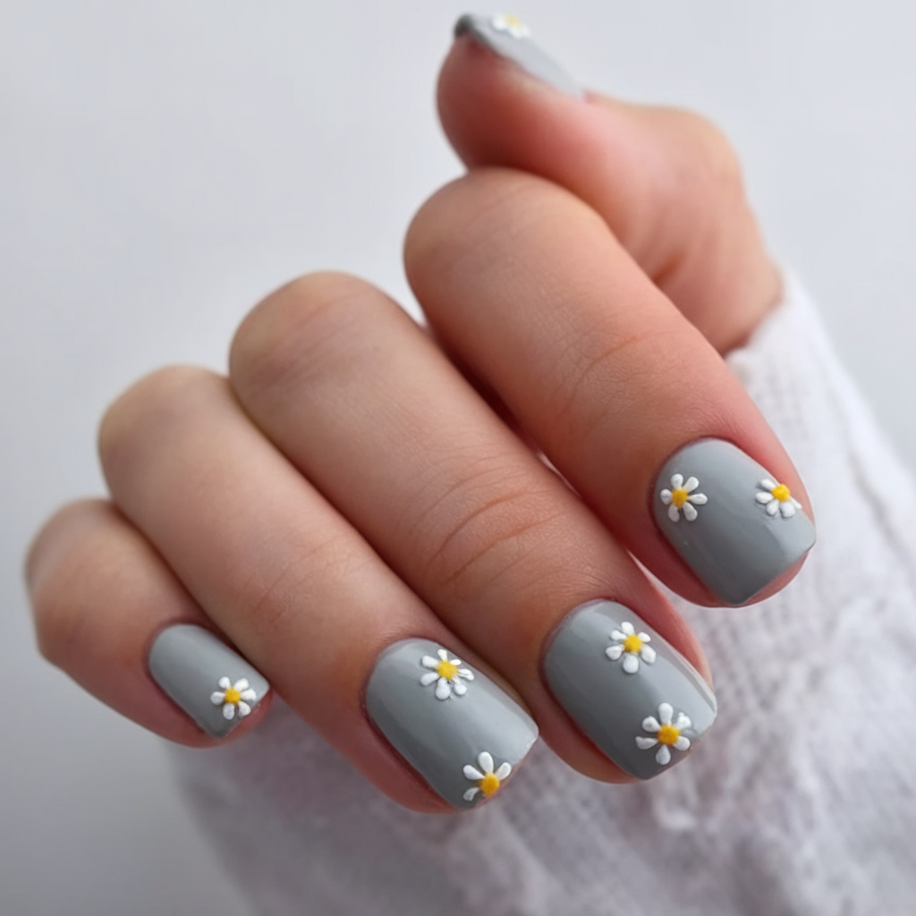 For a chic yet playful look, this design pairs a muted gray base with small hand-painted flowers. The delicate white and yellow daisies create a fresh Easter feel, making this one of the best ideas white for spring. The squoval shape and plain glossy finish give it a modern and sophisticated touch. Perfect for those who love subtle floral inspo in their manicure.