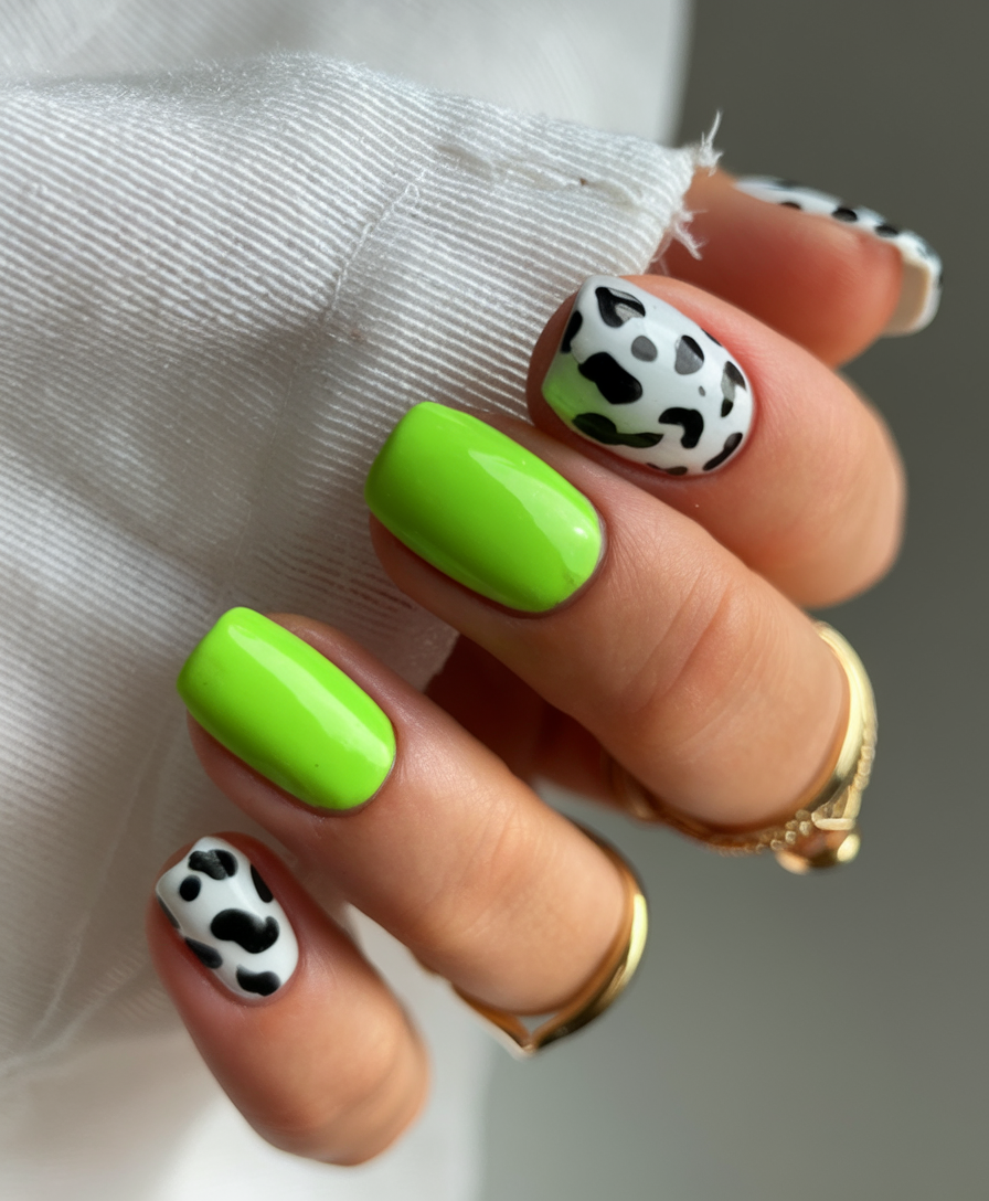 This design is a bold mix of neon ideas green and black-and-white cow print for a trendy contrast. The plain glossy finish keeps the look polished while the medium squared shape adds a modern edge. The mix of solid and patterned nails makes this set a fun and unique choice for ideas 2025. If you’re looking for a daring spring inspo, this manicure is the perfect statement.